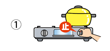 ・器具栓を閉じるか、運転スイッチを切り、すべてのガス機器を止める。屋外の機器も忘れずに。(使っていないガス栓は閉まっていることを確認)