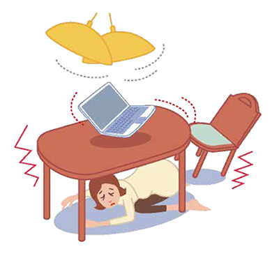 激しい揺れが続いている間は、丈 夫な机やテーブルの下などにもぐ り、机の脚をしっかりと握りま しょう。 座布団などで頭部を保護し、揺れ が収まるのを待ちます。もし可能 であれば戸を開け、出入り口の確 保をします。